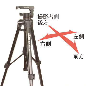 説明の中で三脚の右側左側という表現の意味は、三脚の後方から撮影方向を見て、その左か右という意味です
