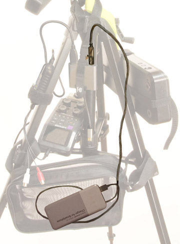 N 受信機にUSB12V昇圧ケーブルをつなぐ、モバイルバッテリーはメッシュのバッグに入れる