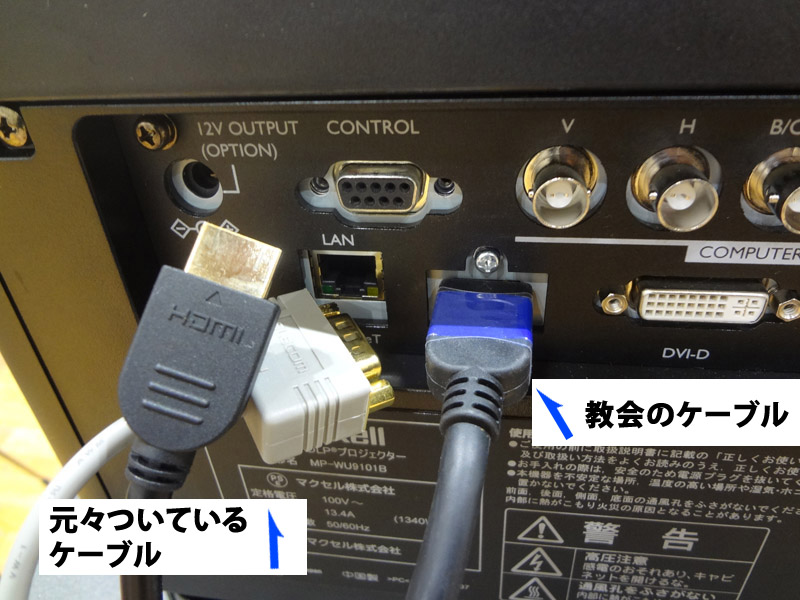あらかじめつながっているHDMIケーブルを抜いて教会のケーブルを差し込む