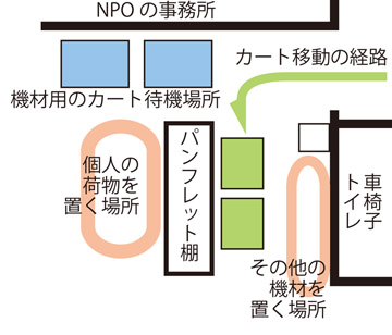 (5)手で運んだ機材はサークルのポスターの下に置く。ただし、壁ぎりぎりに置くこと。「椅子用のカート」を取り出す際に邪魔にならないようにするため。