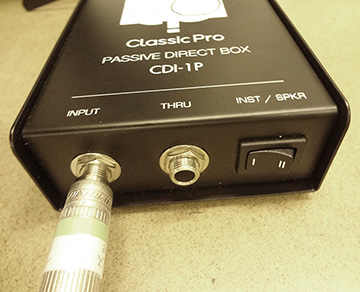 その両者は、端子の形状が異なるので両者の間にダイレクトボックスと呼ばれる黒い小さな金属の箱をつなぎます。