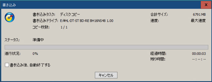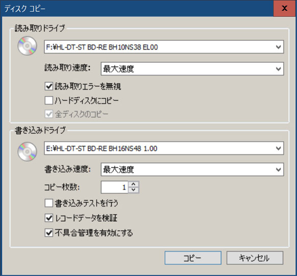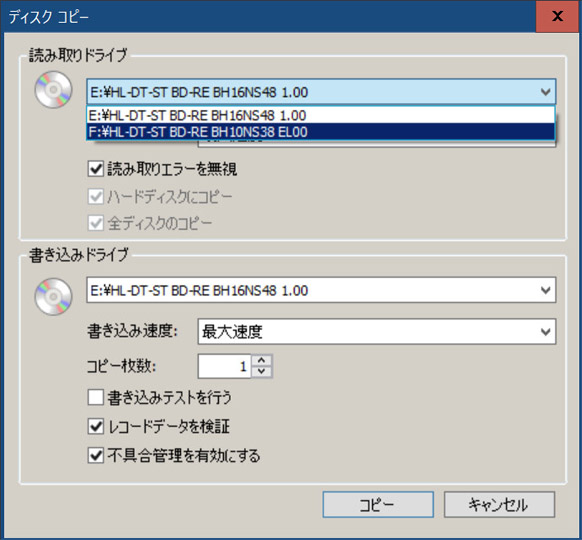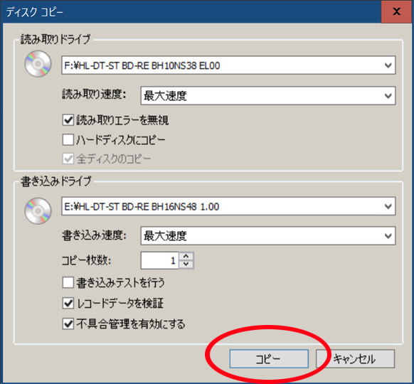 「読み取りドライブ」「書き込みドライブ」両方のDVDドライブが「E」になっているのを確認する。