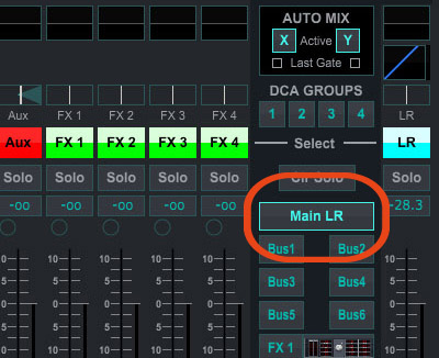 画面の右のほうにある「Main LR」が強調されていたらその画面は主要出力音声のパネルです。