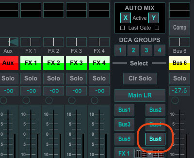 画面の右のほうにある「Bus6」が強調されていたらその画面はAux6(Bus6)音声のパネルです。