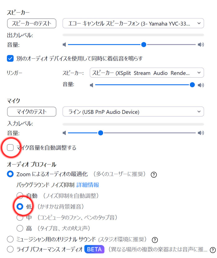 オーディプロフィールはZoomによるオーディオの最適化(多くのユーザーに推奨)の