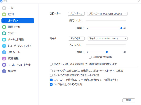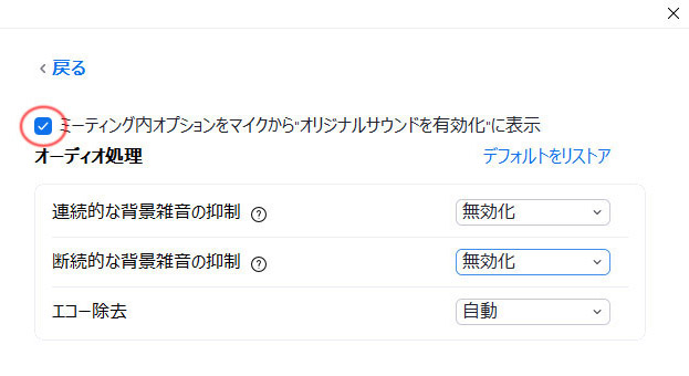 これは絶対必要ではありませんが、下のように「ミーティング内オプションをマイクからオリジナルサウンドを有効化に表示」にチェックを入れておくと、よいでしょう。