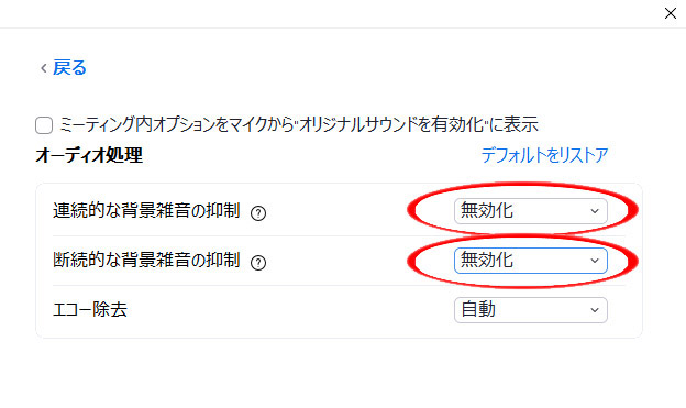 そのページにある「連続的な背景雑音の抑制」と「断続的な背景雑音の抑制」を「無効化」にする。